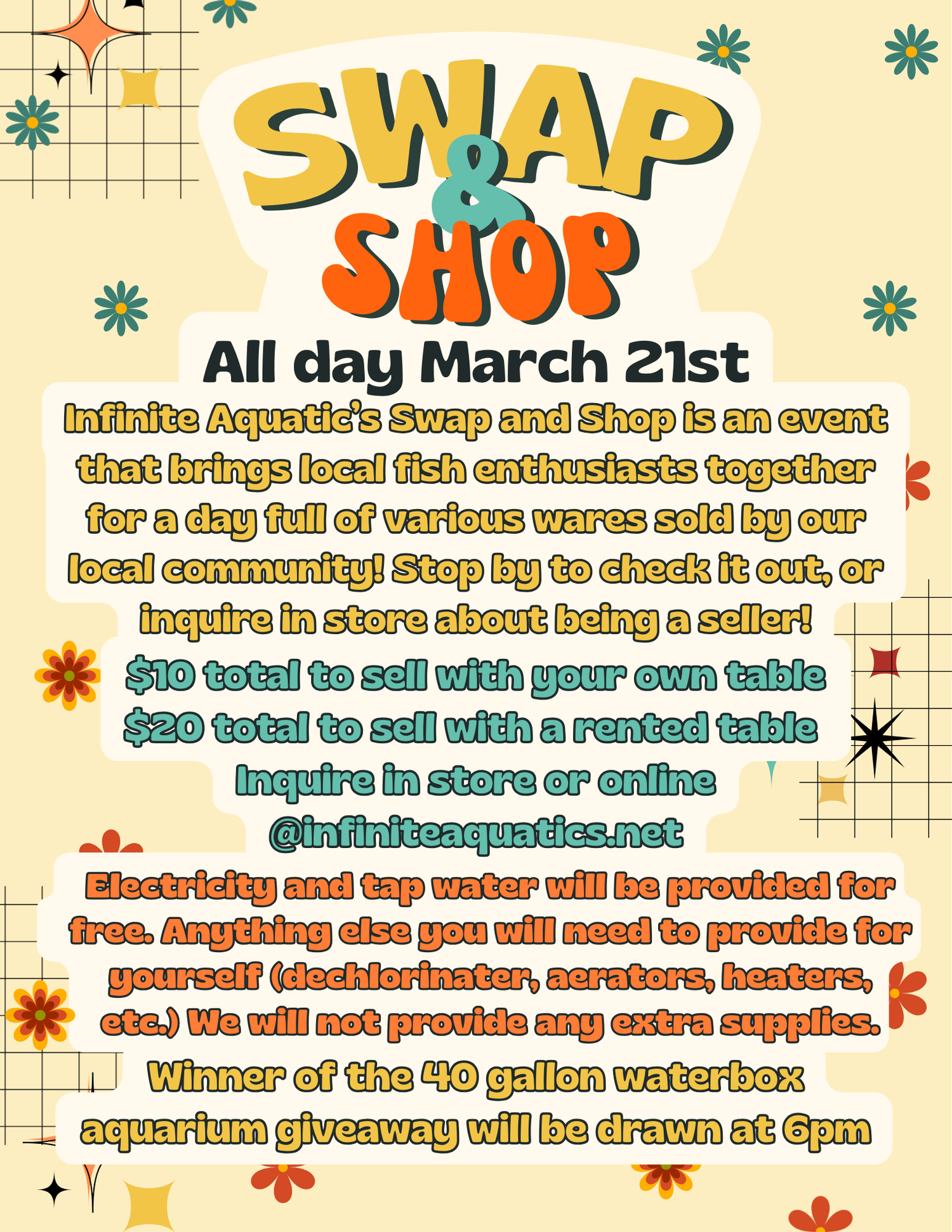 Infinite Aquatics is hosting our 3rd Swap & Shop on March 21, 2026. New and used aquarium equipment, locally bred fish and shrimp, plants and all sorts of other goodies all in one place! Sellers should reserve your tables ASAP, as previous events have filled up fast! Tables are $20 each and we have 20 table spots available. Reserve your spot today and we will see you all soon!